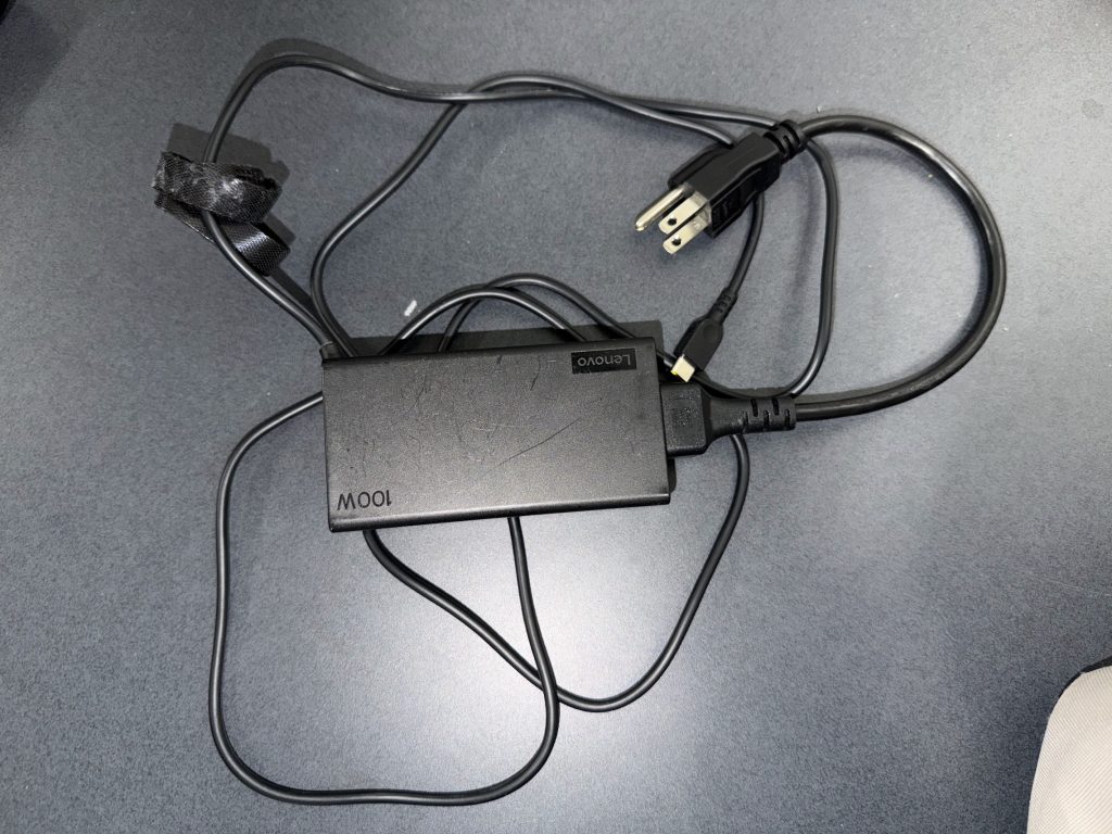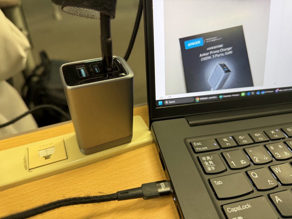 なので付属の100W充電器を持ち歩いていたんですが、電源アダプターに電源ケーブルを繋いで、長いケーブルを伸ばして使う昔ながらのタイプなんですよね。