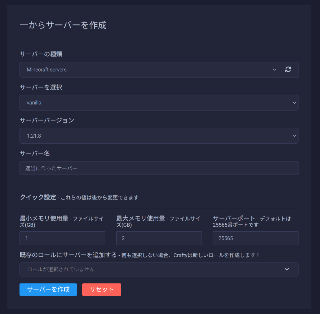 これがサーバーを作成する画面です。基本的に「一からサーバーを作成」を使ってサーバーを立てることになります。