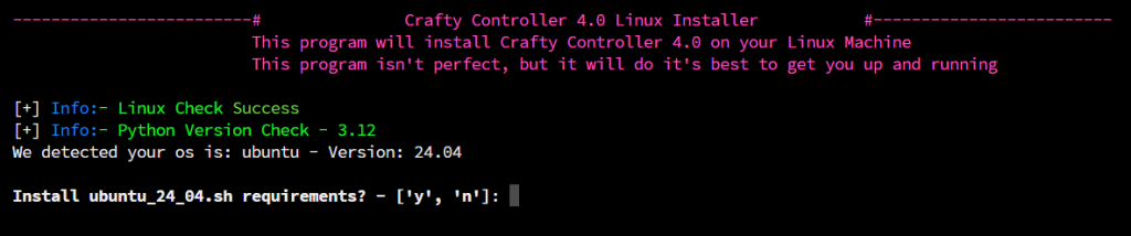 Install Crafty to this directory? /var/opt/minecraft/crafty - ['y', 'n']: