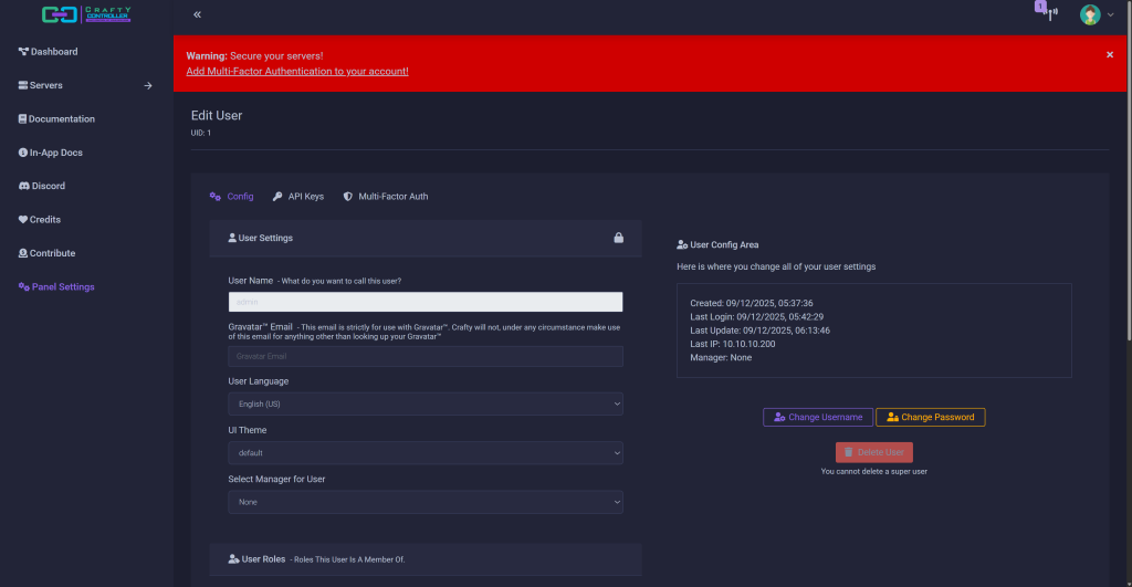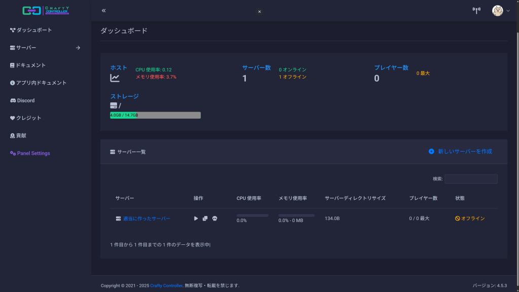 Controller は機能豊富なパネルで、サーバーの作成と実行、プレーヤーの管理、コマンドの実行、サーバー設定の変更、サーバー ファイルの表示と編集、バックアップの作成を行うことができます。Crafty Controller を使用すると、多数の Minecraft サーバーを別々のバージョンで簡単に直感的に管理できます。