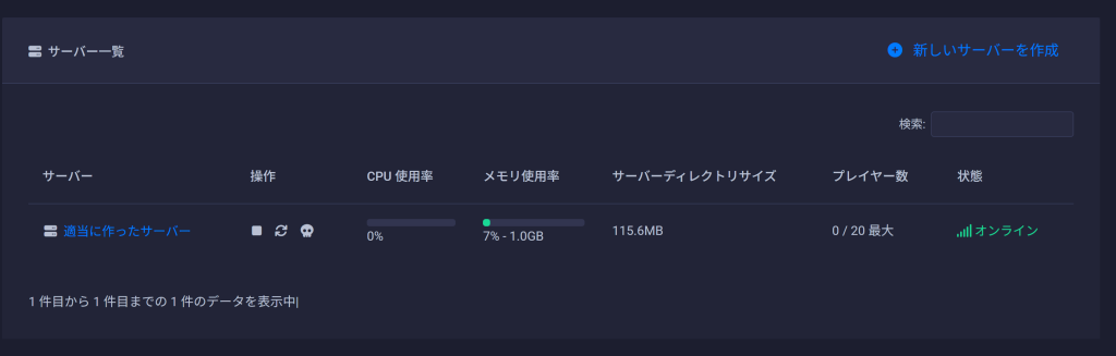 サーバーが作成されました。サーバー一覧に今作ったサーバーが表示されています。「操作」から起動してみます。初回起動時はEULAの同意を求められるので、同意します。